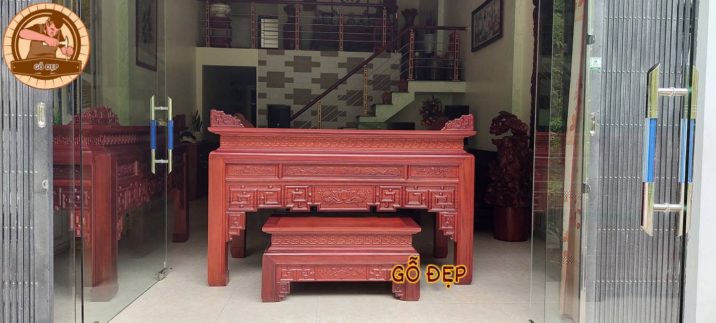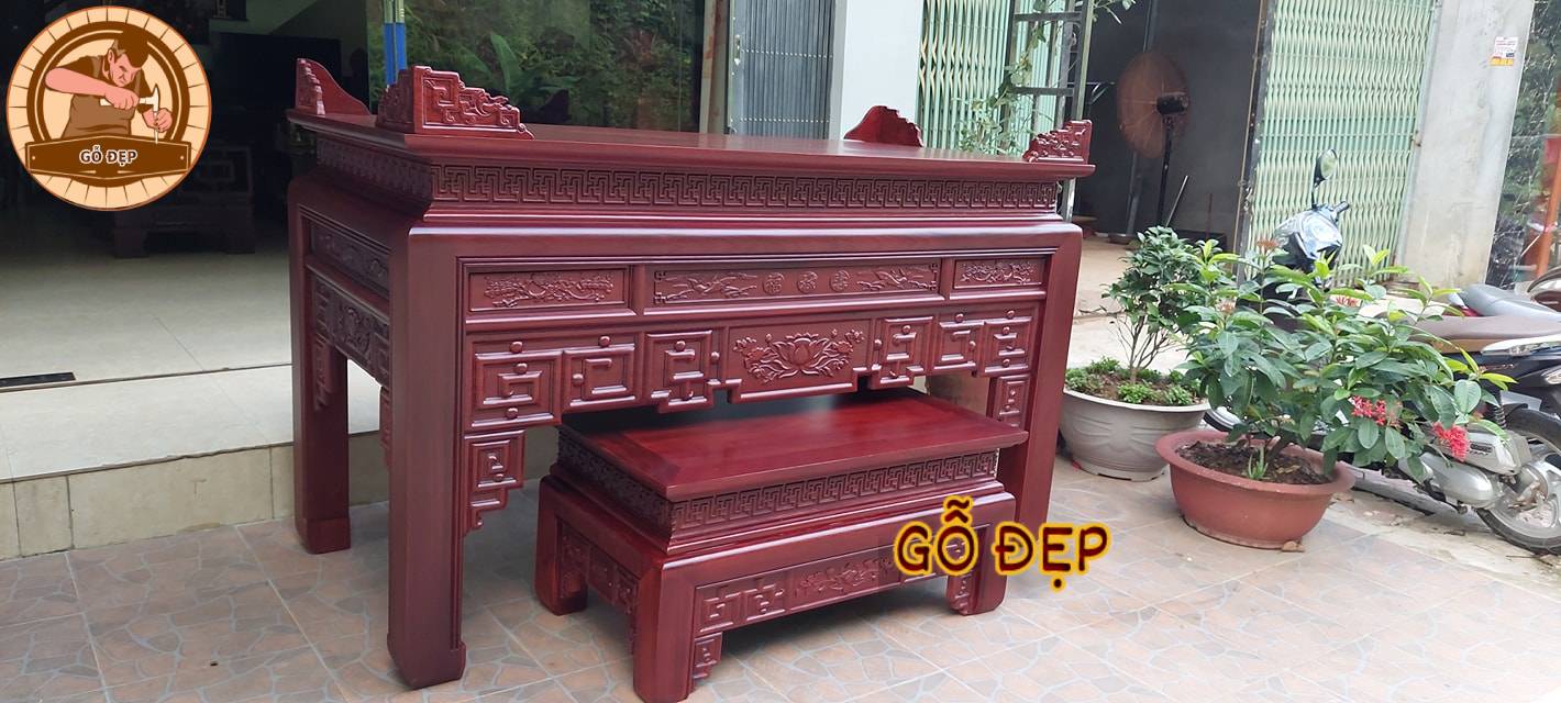 Với chất liệu gỗ hương đỏ tự nhiên, sản phẩm này có độ bền cao, không bị mối mọt hay cong vênh theo thời gian. Án Gian Gỗ Hương Đỏ BT 882 mang đến sự sang trọng và đẳng cấp cho không gian thờ cúng của gia đình bạn.