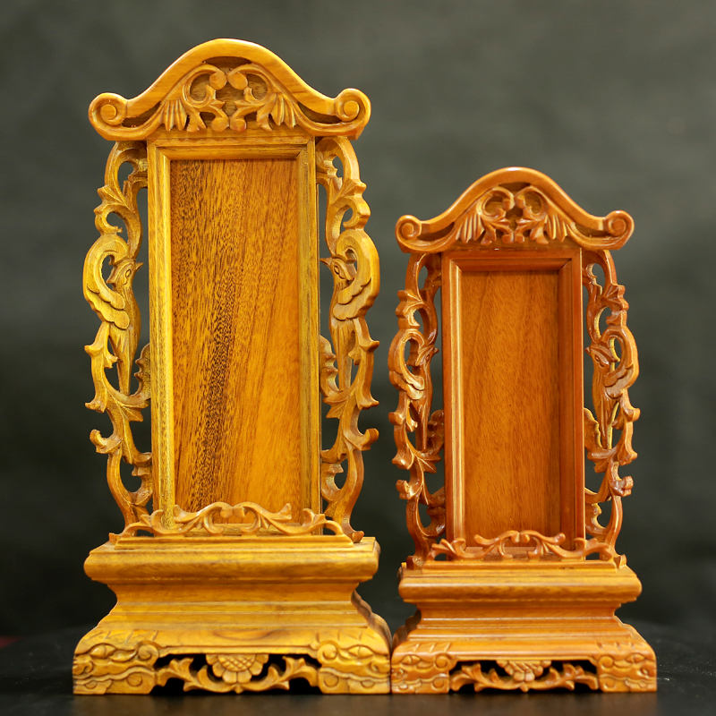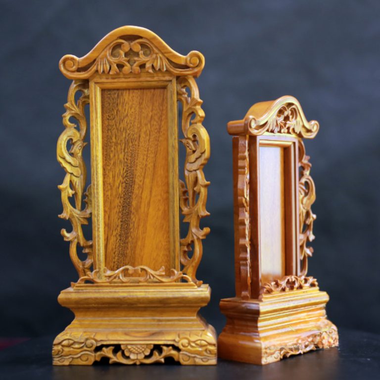 Bài vị đặt trên bàn thờ gỗ Long Não Viền khắc hình Phụng, vẻ đẹp trầm ấm Nét điêu khắc tinh xảo, tỉ mỉ từng chi tiết Kỷ niệm vinh quang, tình thân bất diệt.