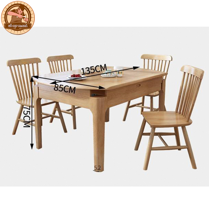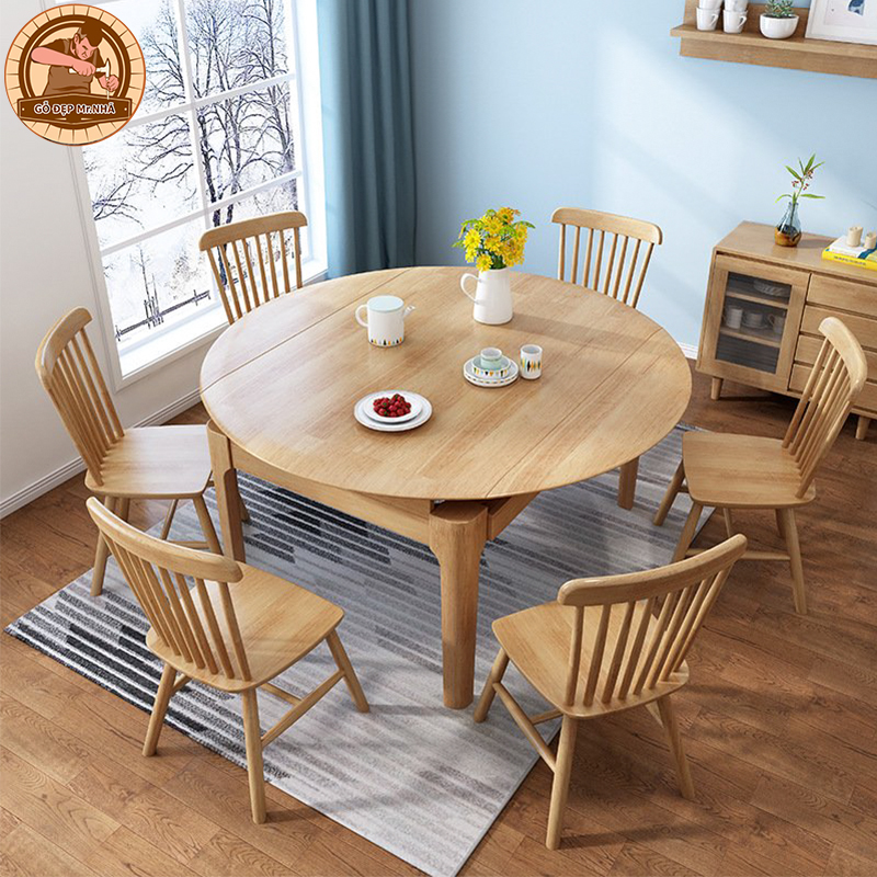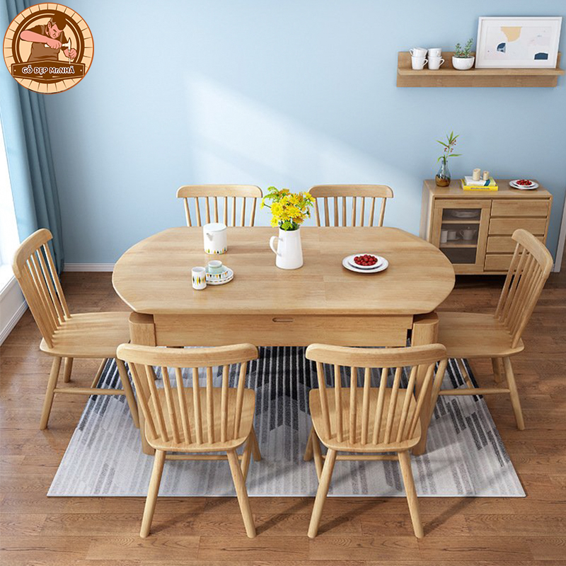 Bàn ăn có kiểu dáng hiện đại, tạo cảm giác sang trọng và tinh tế cho không gian ăn. Bề mặt bàn được làm bằng gỗ đẹp và bền bỉ thiết kế sang trọng. Kích thước bàn vừa phải, phù hợp cho gia đình nhỏ hoặc căn hộ có diện tích nhỏ.