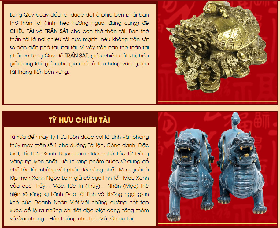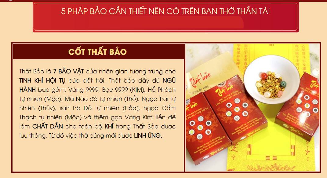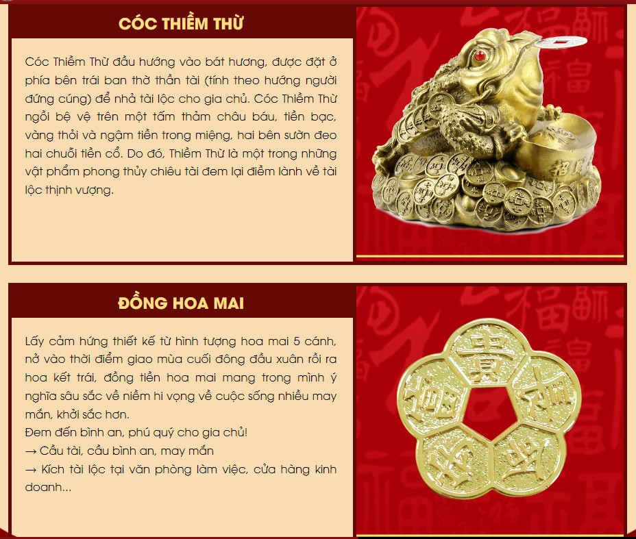 Bày trí những vật phẩm tượng trưng cho sự giàu có và phú quý. Các vật phẩm này có thể bao gồm tiền xu, vàng, kim cương, bảo lộc và các đồ trang sức quý giá. Ngoài ra, có thể sử dụng các loại cây cảnh phong thủy, hoa sen, nến và nhang để tăng thêm sự trang nghiêm và linh thiêng cho bàn thờ.