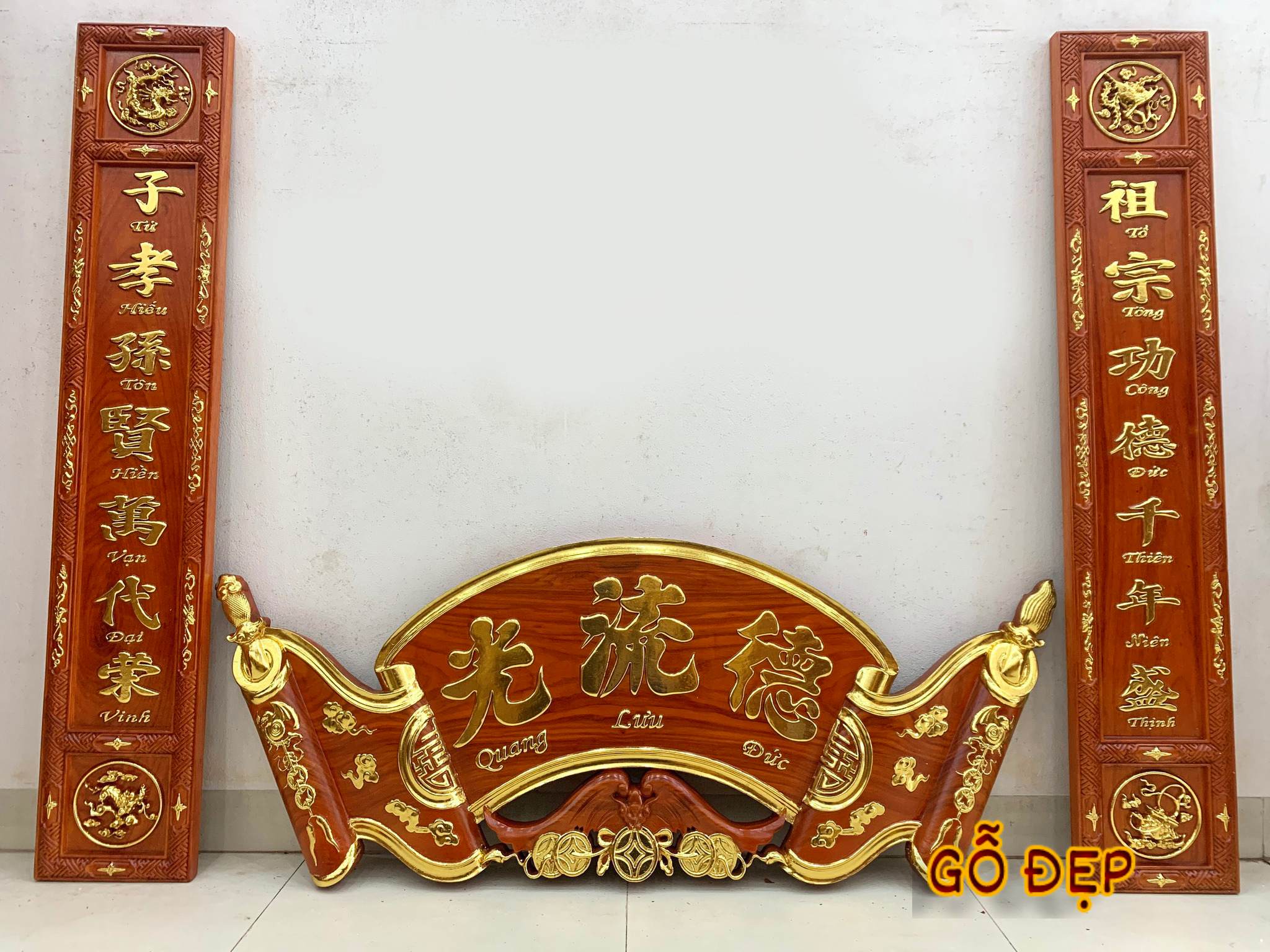 Khi nhìn vào Cuốn Thư Câu Đối Dát Vàng Đức Lưu Quang tại Xưởng Gỗ Đẹp, bạn sẽ bị mê hoặc bởi sự hoàn hảo trong từng chi tiết. Với kích thước lớn, dài 175cm, rộng 67cm và dày 6cm, nó tỏa sáng trong không gian với vẻ đẹp vượt thời gian.
