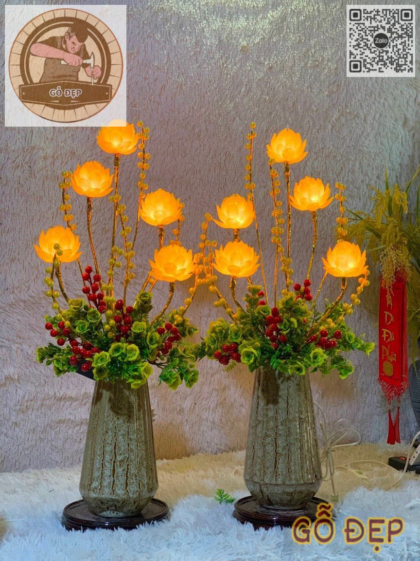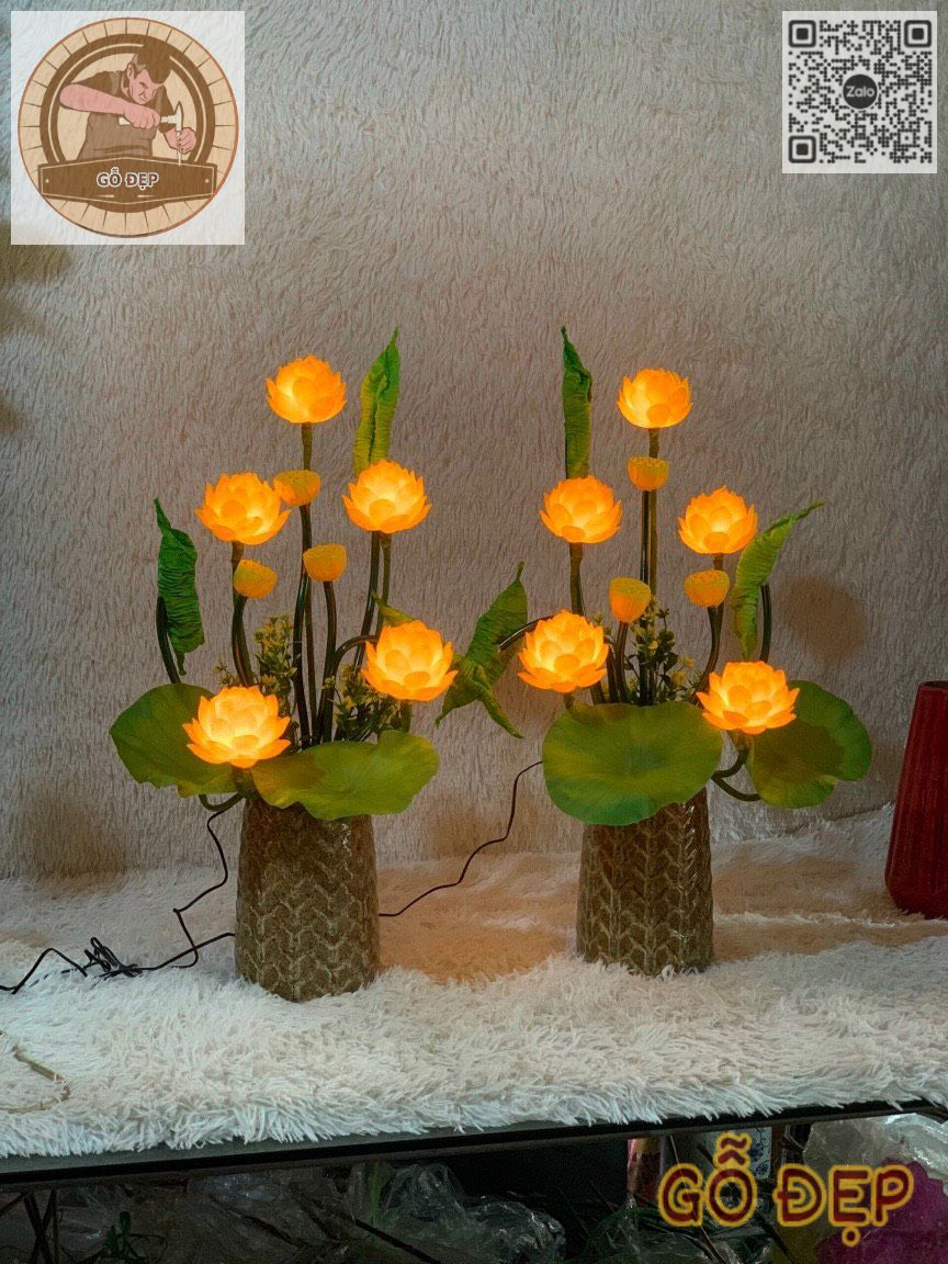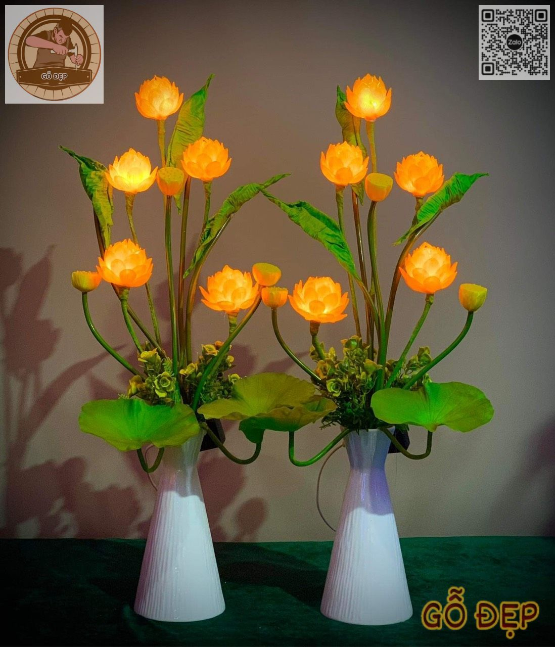 Đèn hoa sen chất liệu nhựa, lá xilicon và bình gốm sứ là những loại đèn trang trí phổ biến được sử dụng để trưng bày trên bàn thờ trong các nghi lễ tôn giáo.