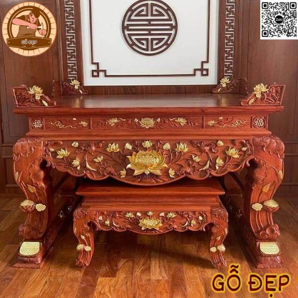 Sập thờ sen gỗ hương 2 cấp ST 66837 là một sản phẩm đẹp và chất lượng, đáp ứng các yêu cầu về kích thước lỗ ban cho việc thờ cúng gia tiên.
