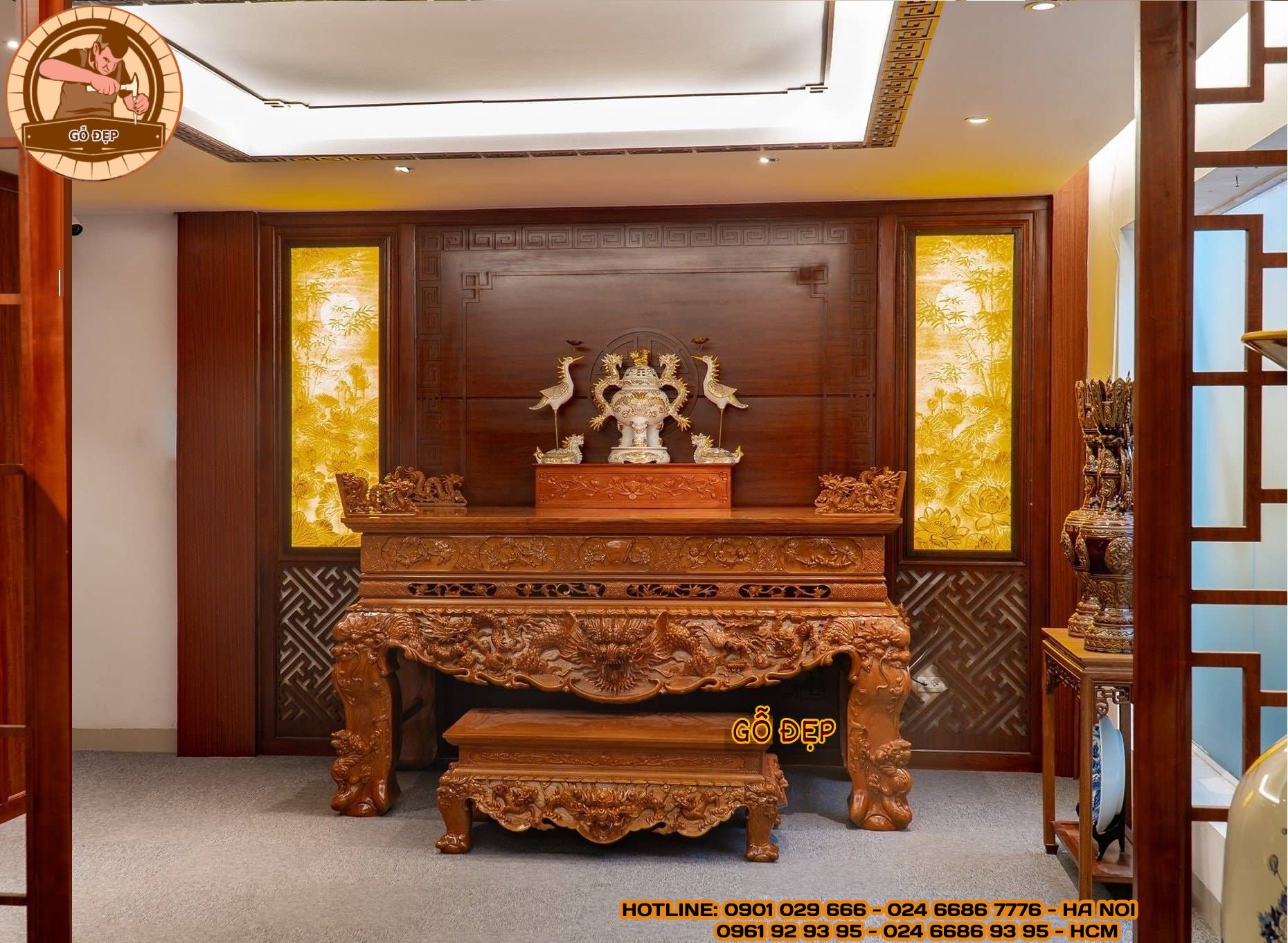 Mỗi chi tiết trên sập thờ đều được chạm khắc tinh xảo, tạo nên những họa tiết Tứ Linh (Rồng, Ngựa, Phượng, và Xích Lô) đẹp mắt và sắc nét.
