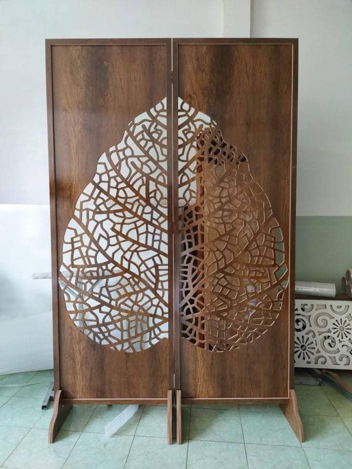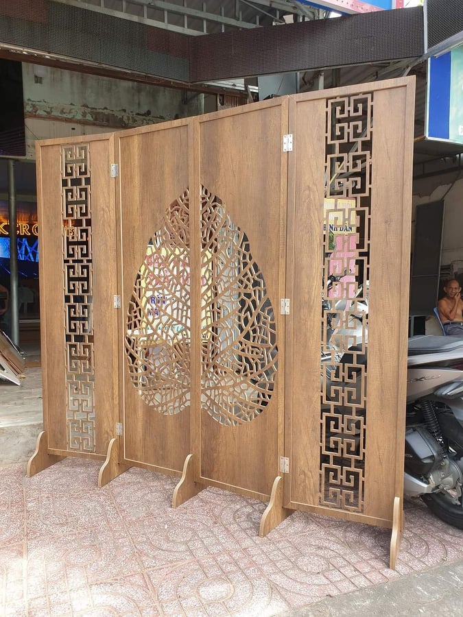 Vách Bình Phong Lá Bồ Đề-05 được thiết kế với hình dáng chữ nhật và được trang trí bằng hình ảnh những chiếc lá bồ đề tinh tế và đẹp mắt, tạo nên một phong cách trang trí tự nhiên và hiện đại. Thiết kế này không chỉ tạo ra khả năng phân chia không gian mà còn giúp bạn tạo ra sự tự nhiên và hiện đại cho không gian sống.